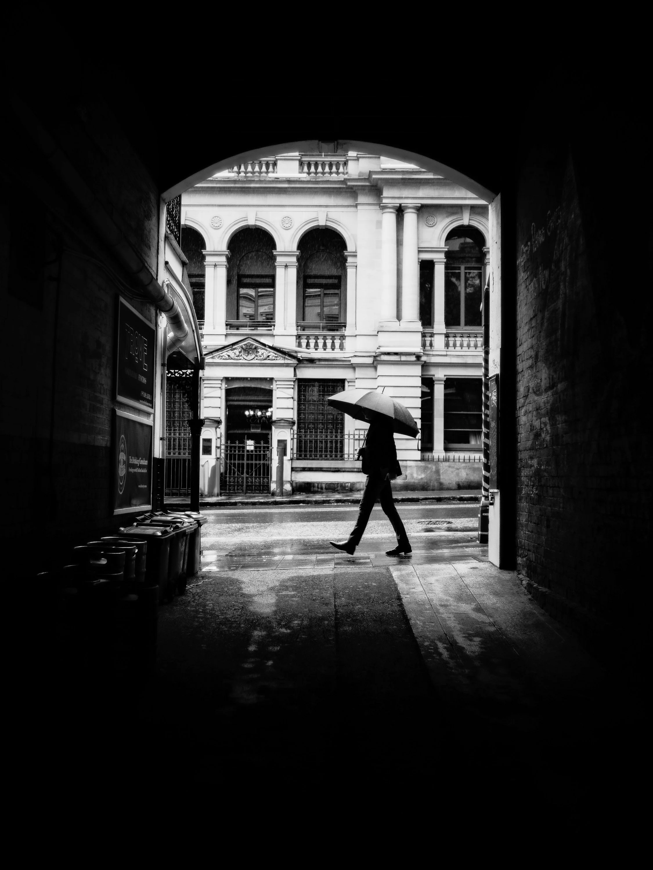 Tucked into the deep, cinematic shadows of the Meriton, this work captures a rare collision of history and atmosphere. A lone silhouette serves as a living bridge between the lane’s gritty, industrial interior and the ornate, neoclassical facade beyond.